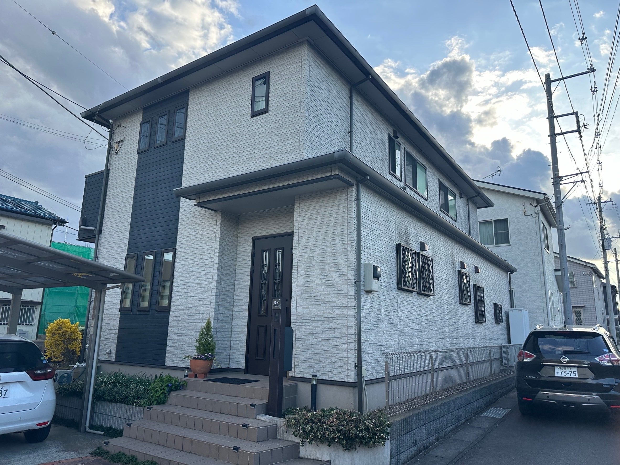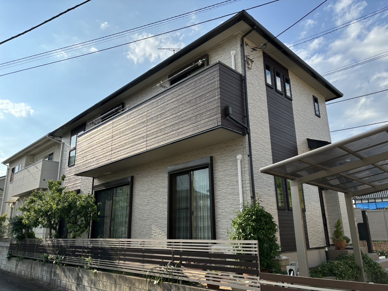 景観を維持する為、大きい外壁面に関してはクリアーを、木目調サイディング部については、色褪せが目立っていた為、着色塗装3分艶を致しました。