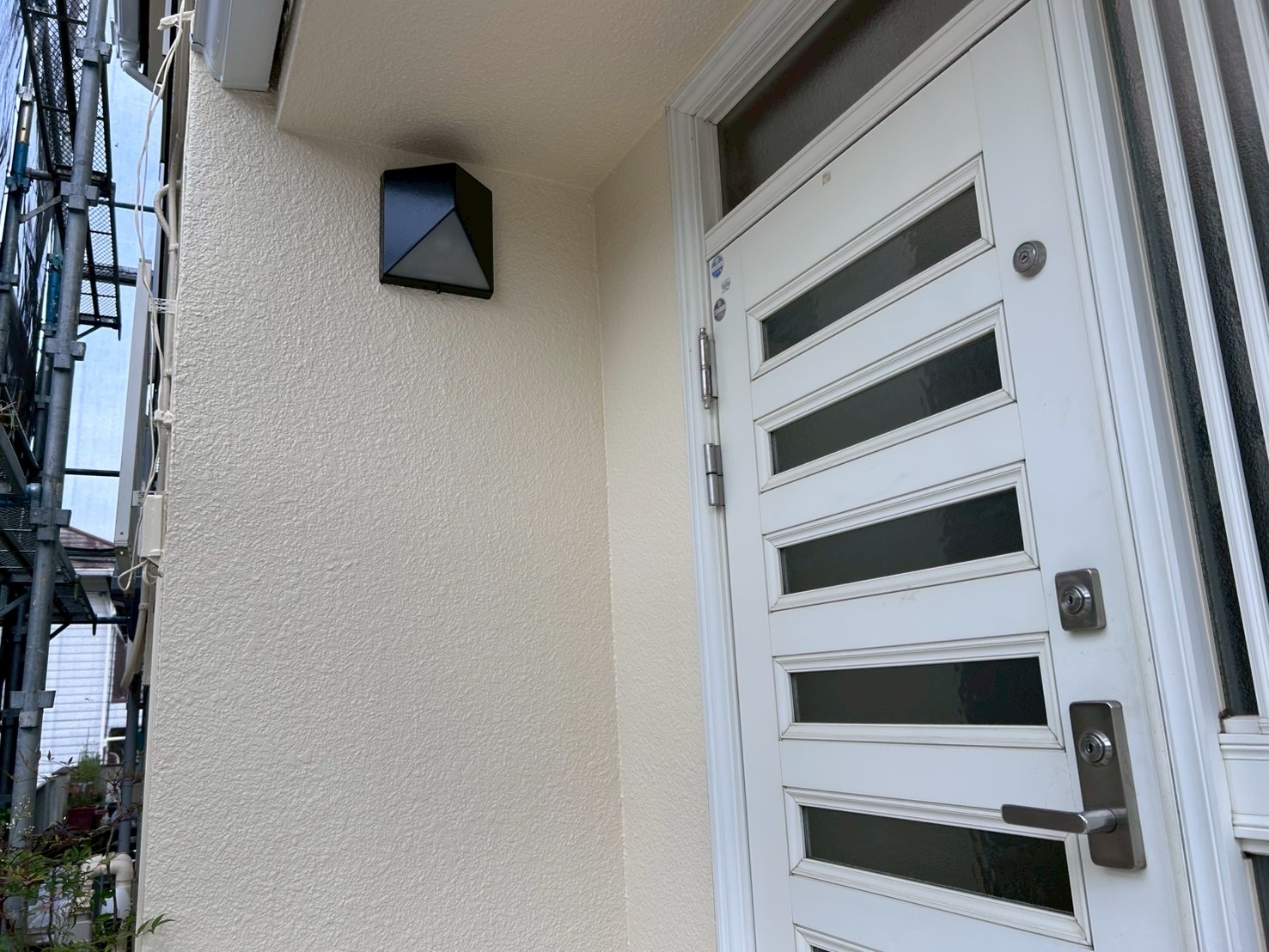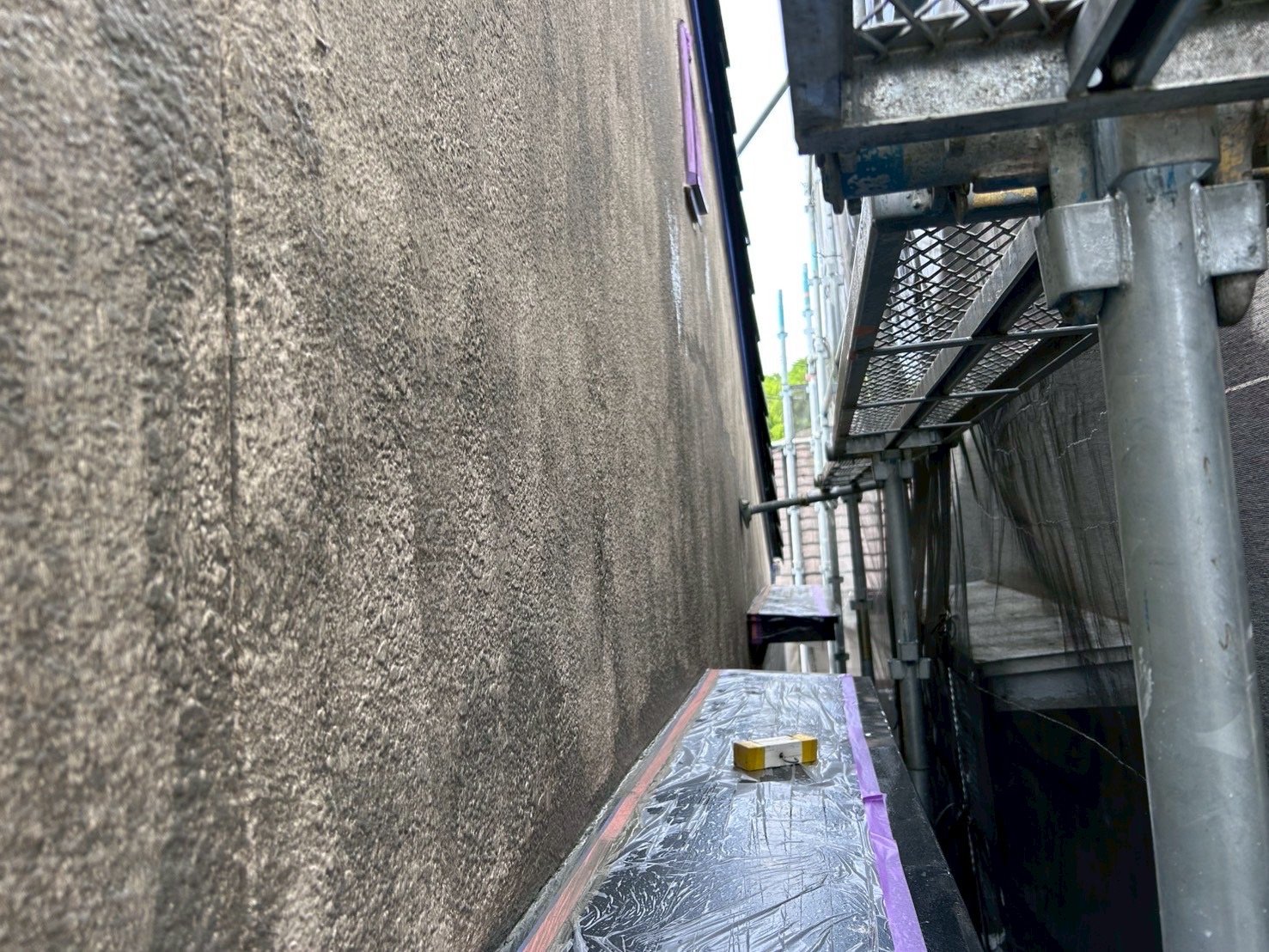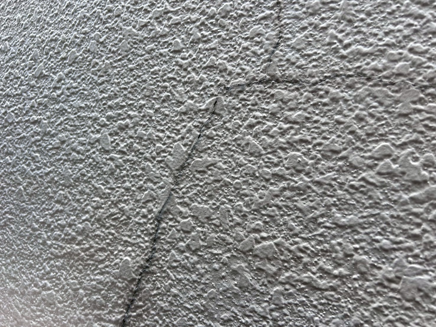 雨漏りの箇所から、原因が外壁のクラックや隙間からの影響が大きかった為、下地調整材を全体に施し、クラック部はコーキングではなく、改修材のレジアンダーを使用し組まなく処理を施した後に下塗り含め3回塗りにて仕上げました。