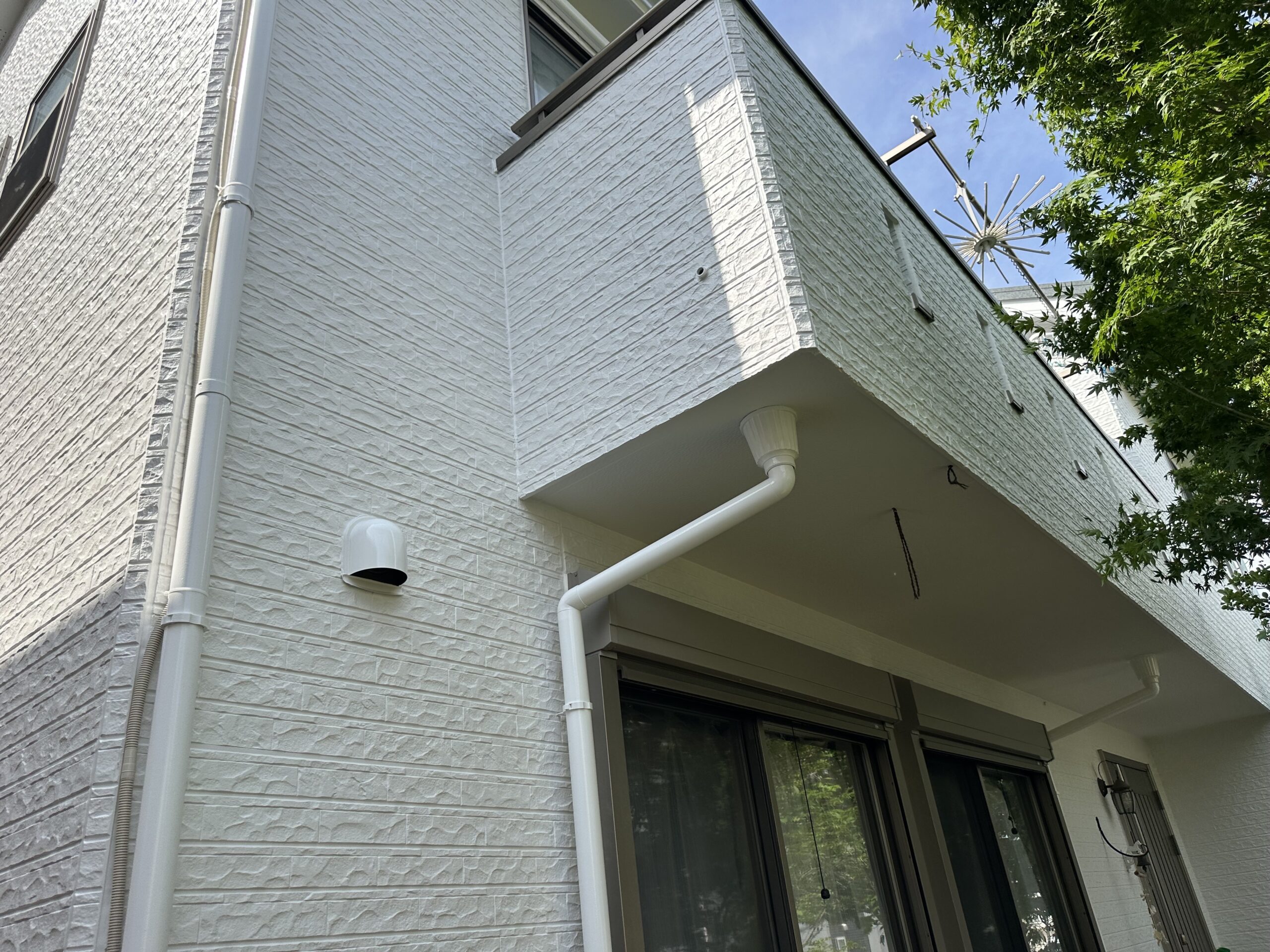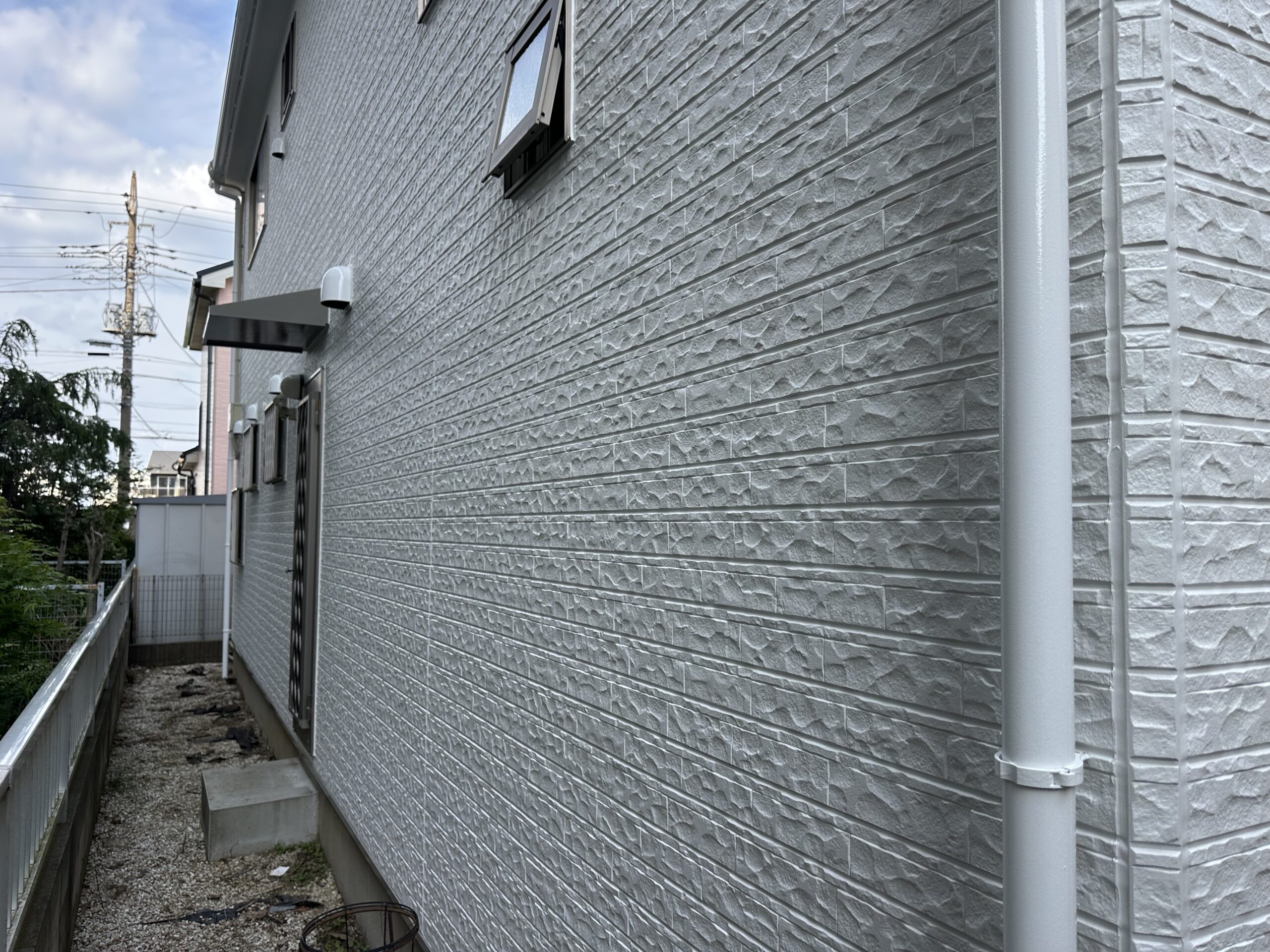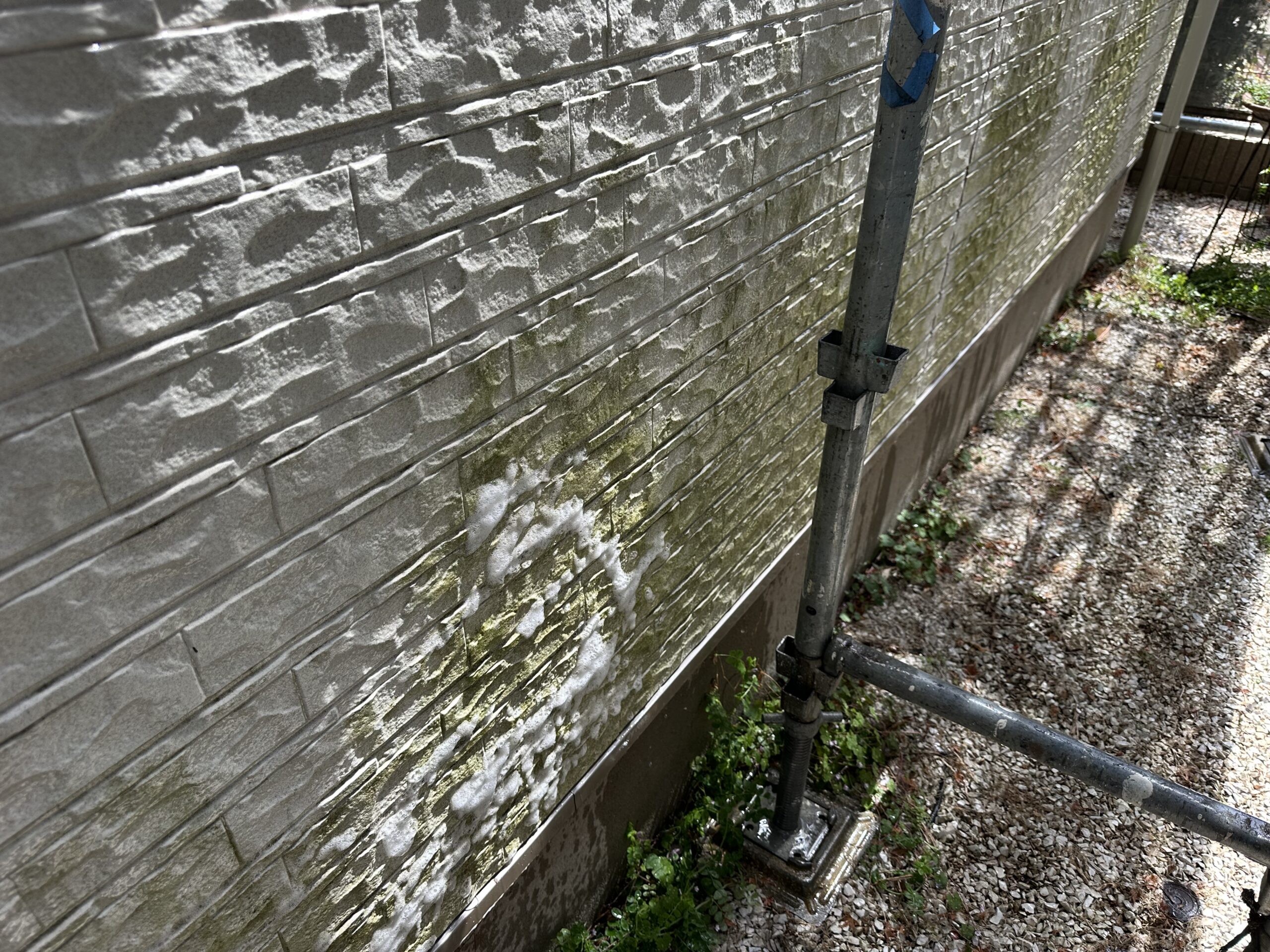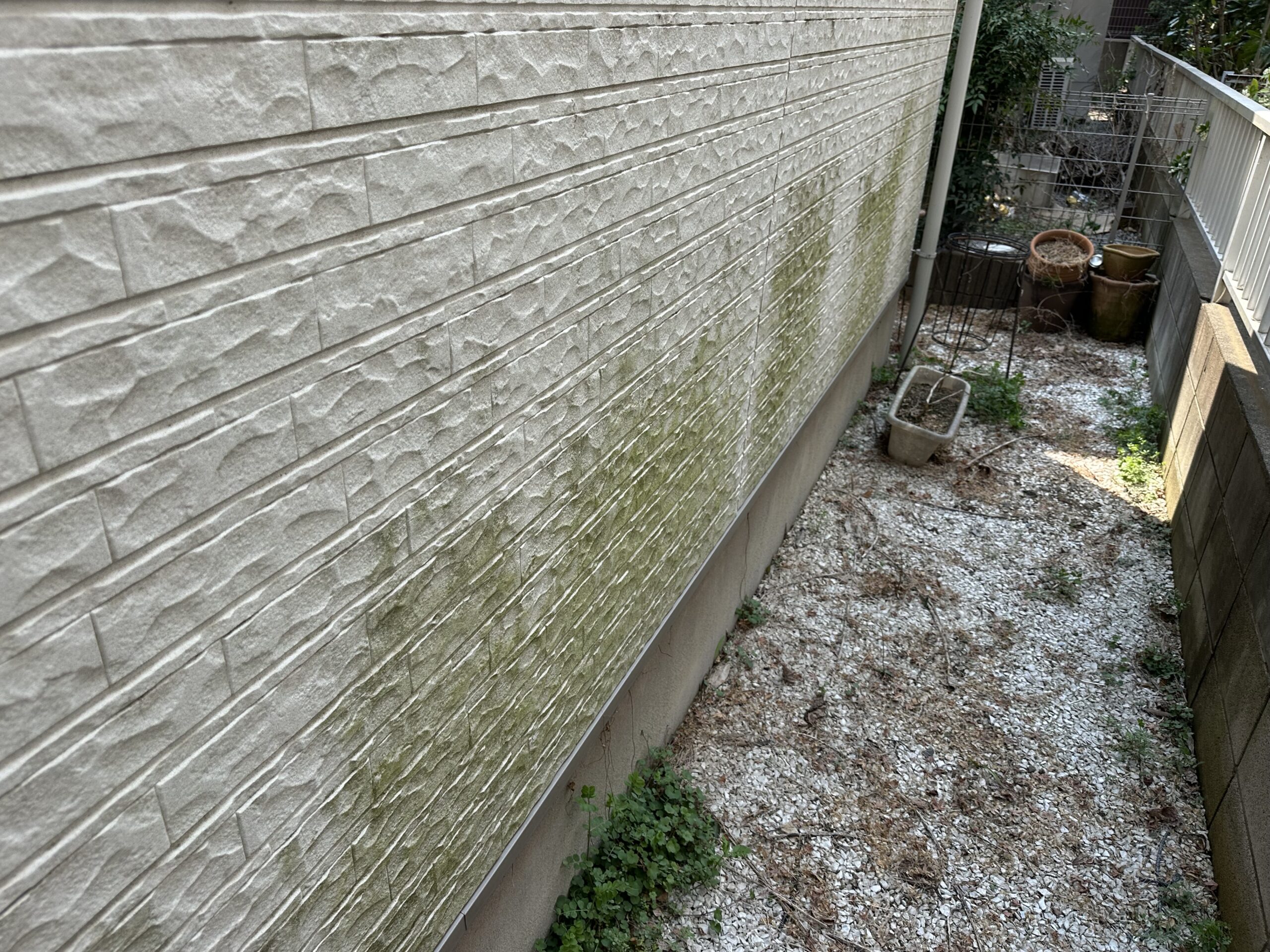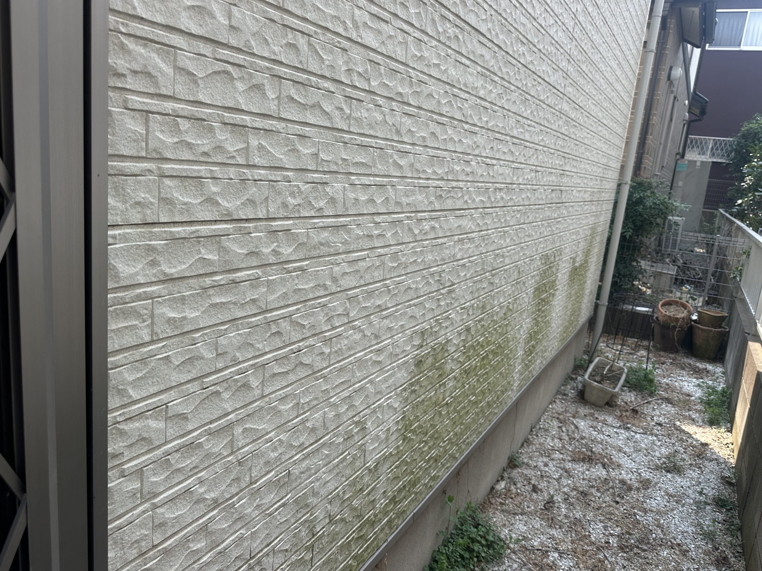 元々、新築時に外壁を白で注文していたが、仕上がってみると白にクリームが入っている色合いになった為、新築時の希望の色にしたいがコケがきになる。、との事でしたので、塗料は、日本ペイントのグランセラトップ1液水性を推奨致しました。こちらの塗料は耐久性も約20年と長寿命でありながら、通常はオプションの強力防かび仕様が標準仕様で入っていまして、カビの発生に非常にしずらい塗料ですので、白系にて塗装しても心配が少ない為、ご提案致しました。