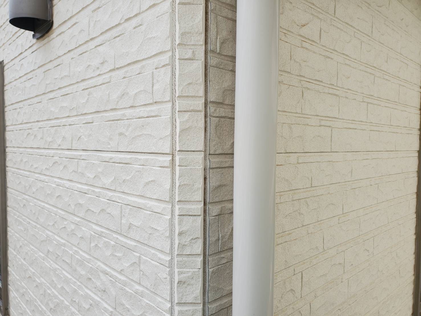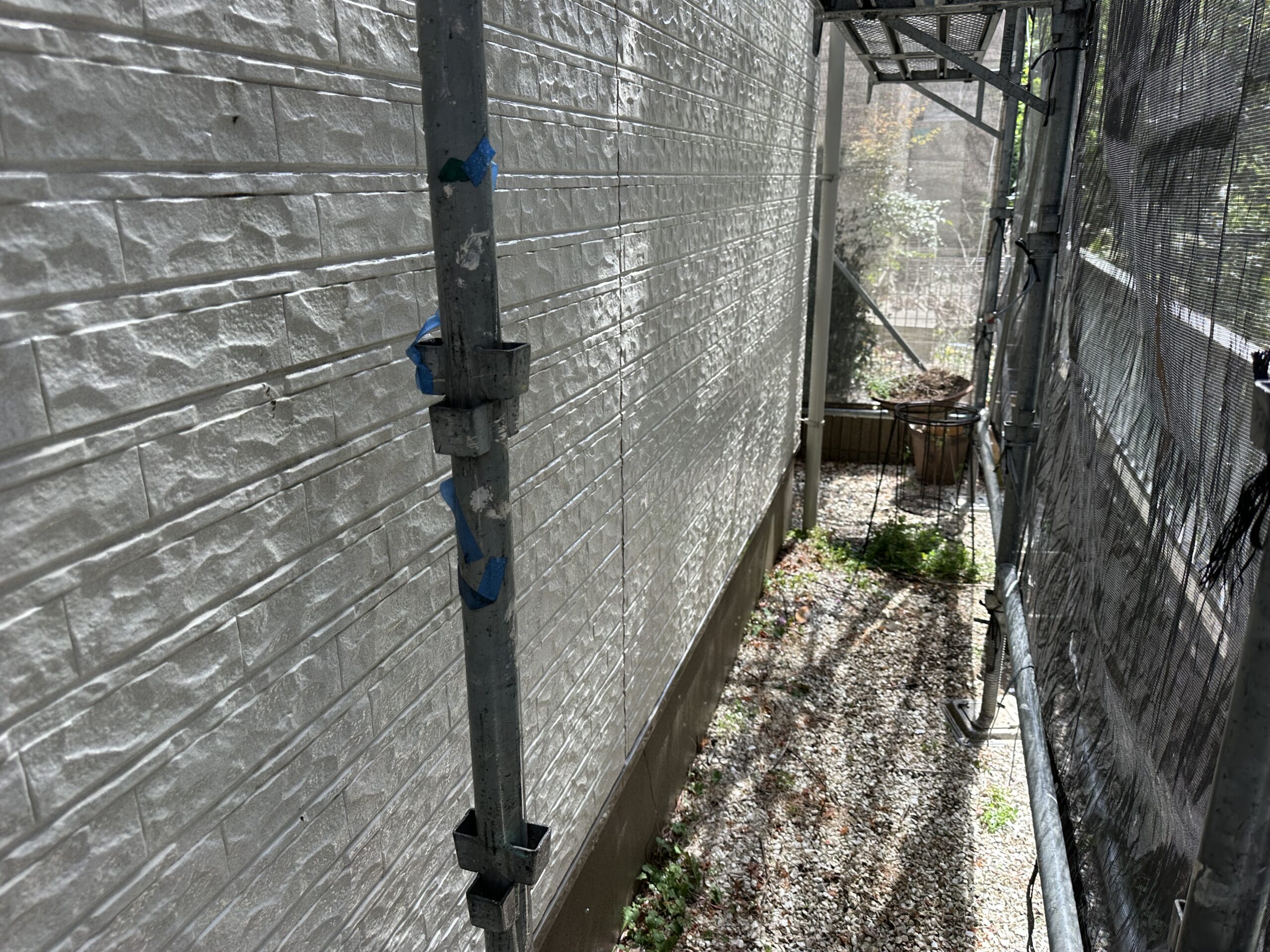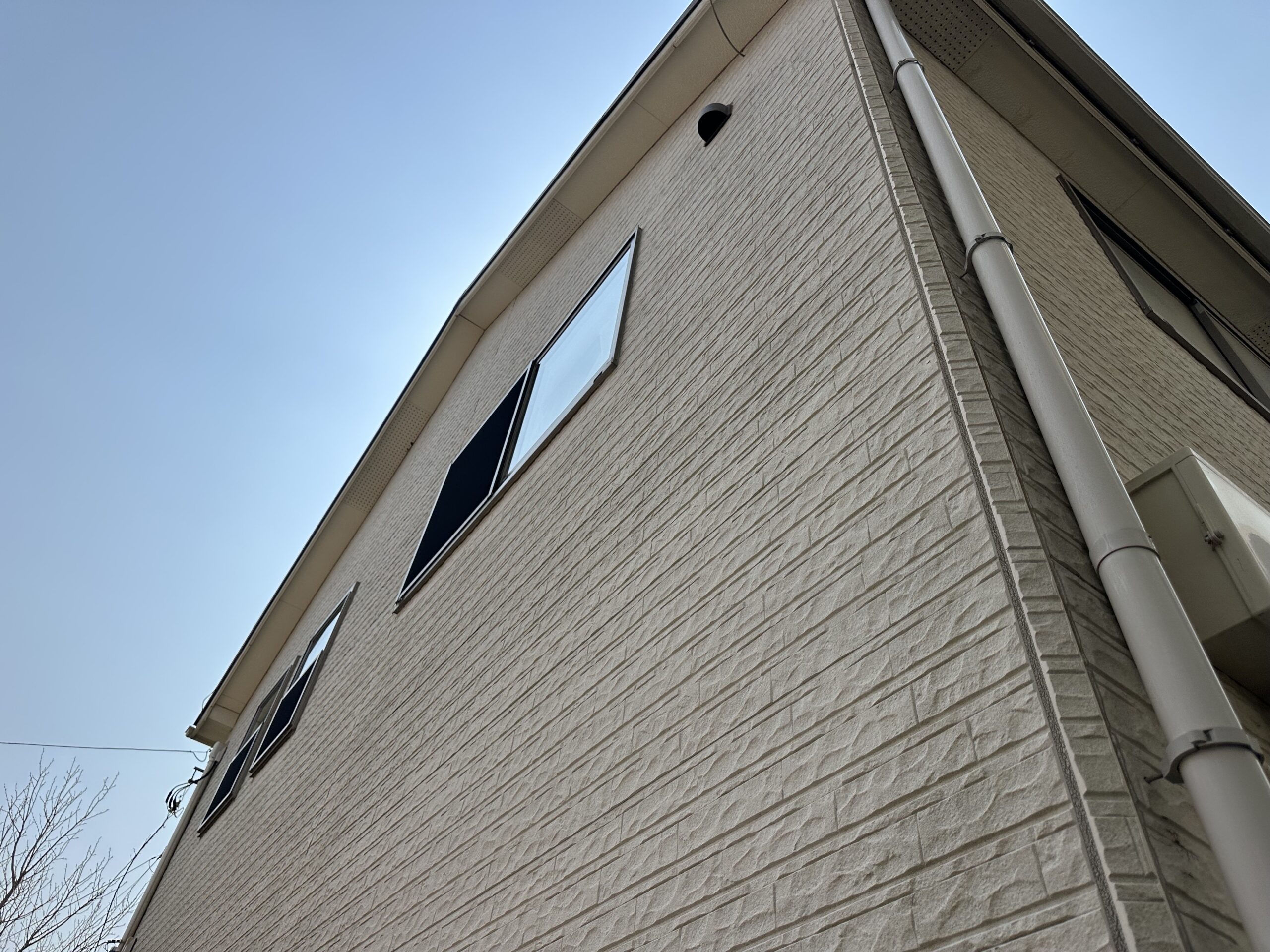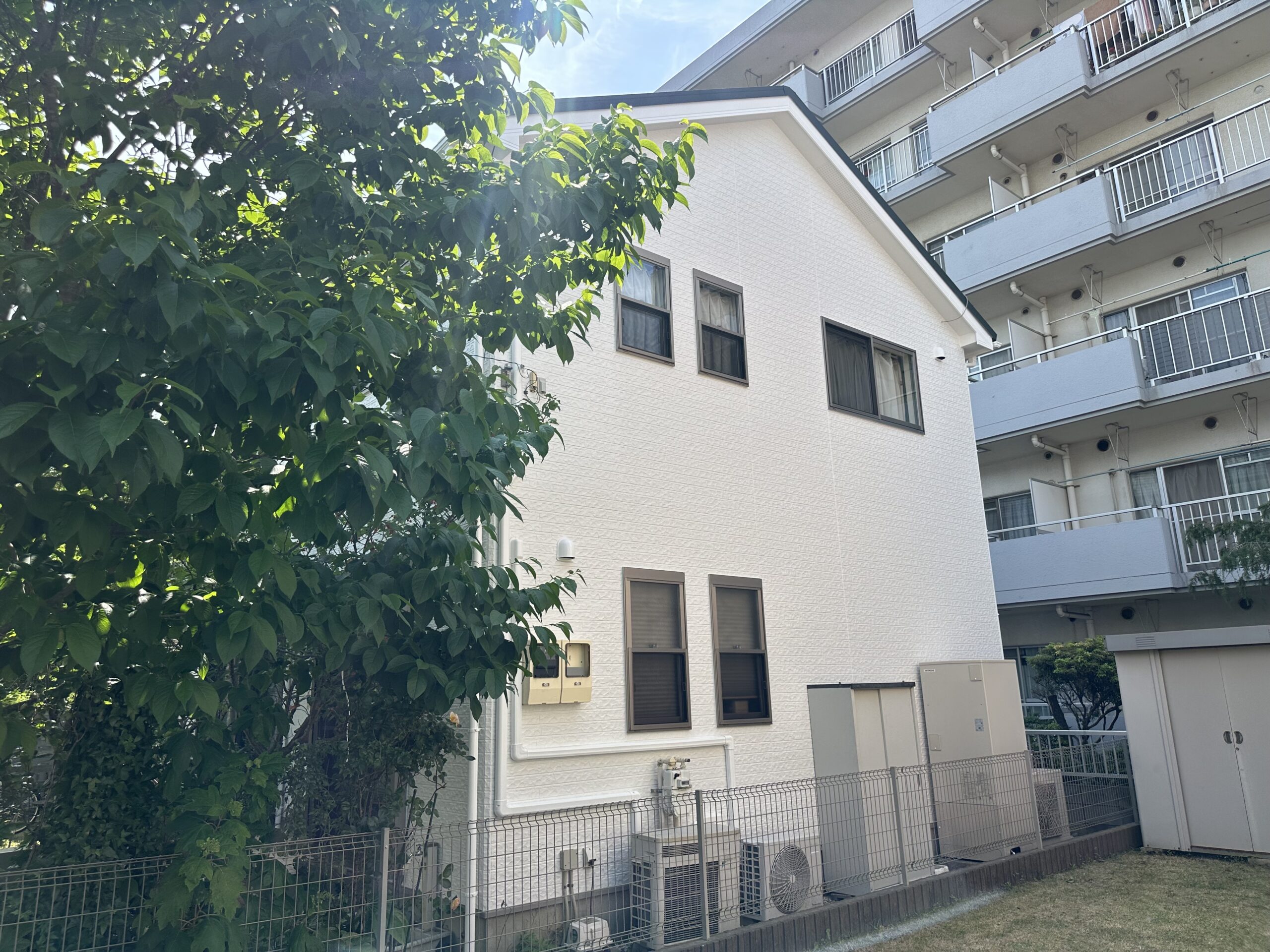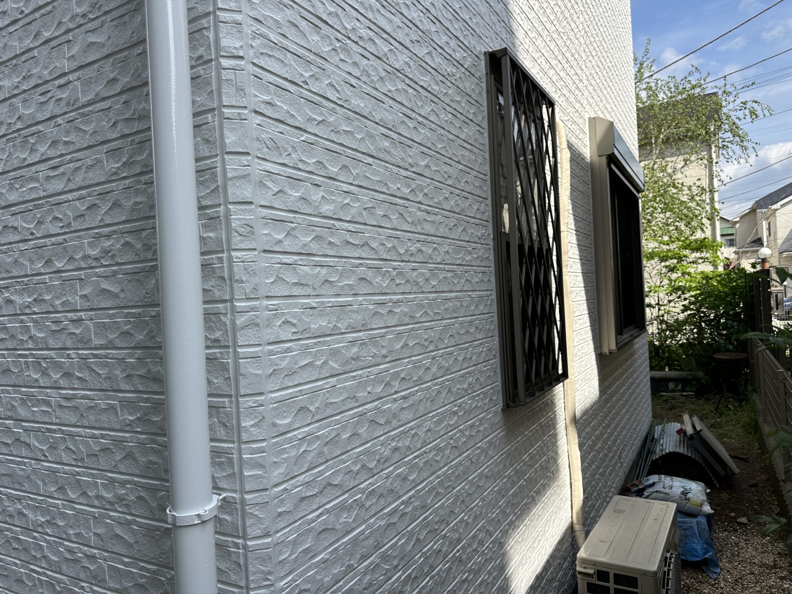 元々、新築時に外壁を白で注文していたが、仕上がってみると白にクリームが入っている色合いになった為、新築時の希望の色にしたいがコケがきになる。、との事でしたので、塗料は、日本ペイントのグランセラトップ1液水性を推奨致しました。こちらの塗料は耐久性も約20年と長寿命でありながら、通常はオプションの強力防かび仕様が標準仕様で入っていまして、カビの発生に非常にしずらい塗料ですので、白系にて塗装しても心配が少ない為、ご提案致しました。