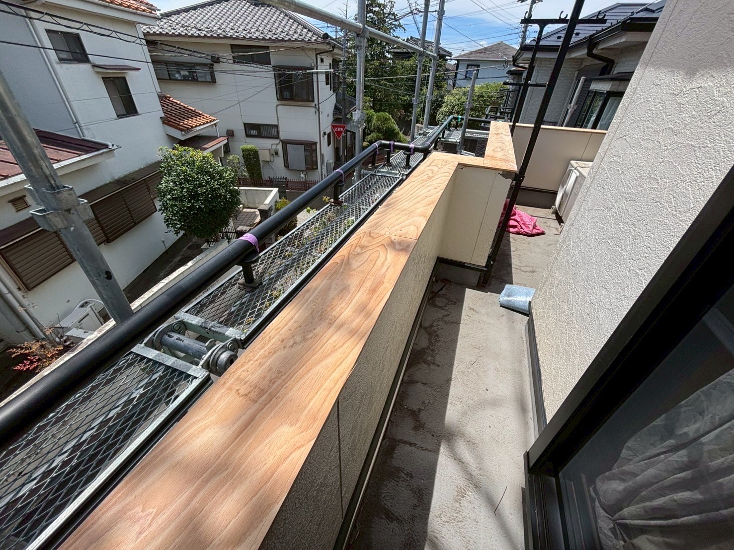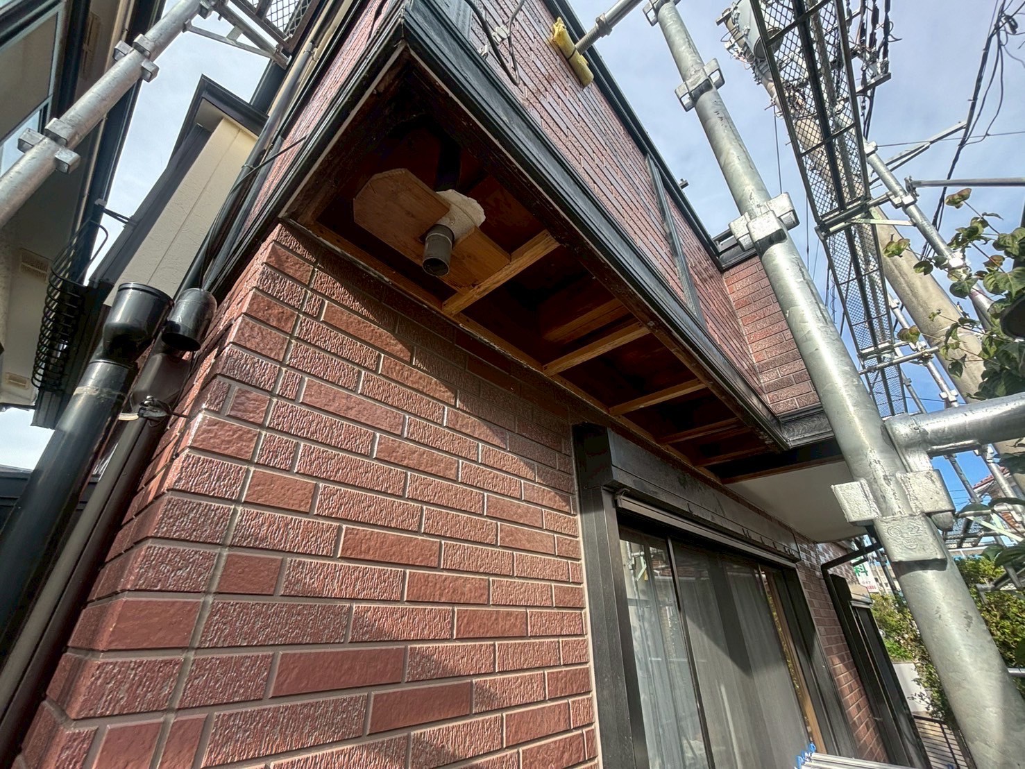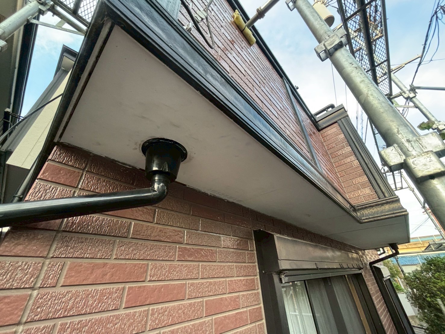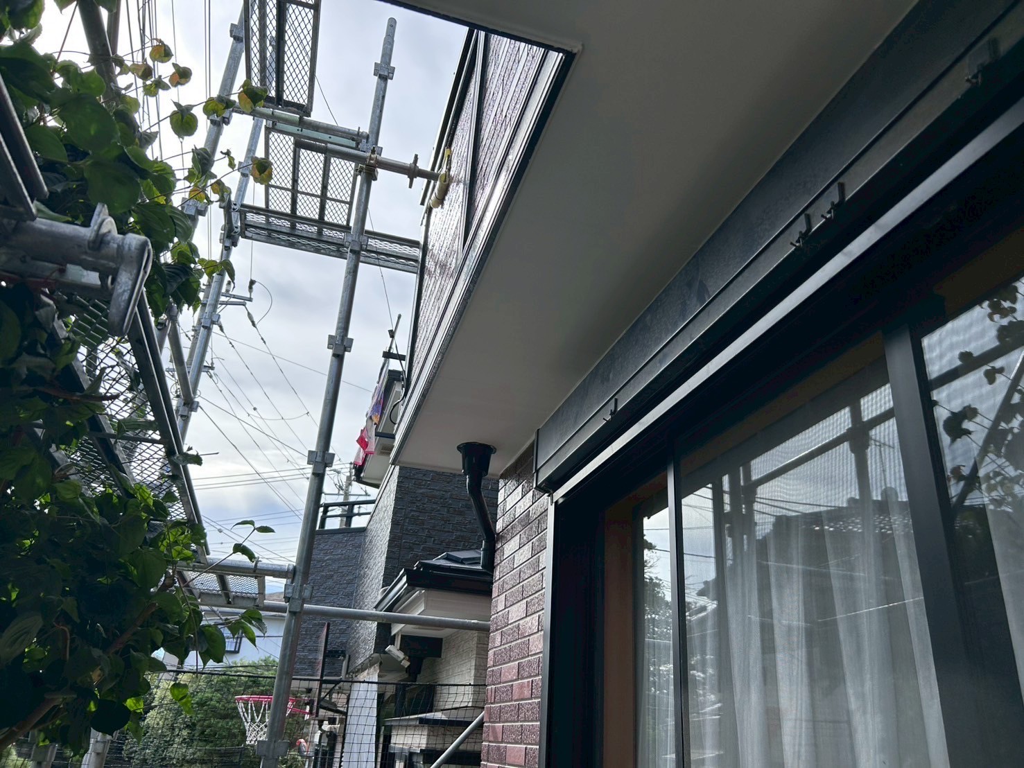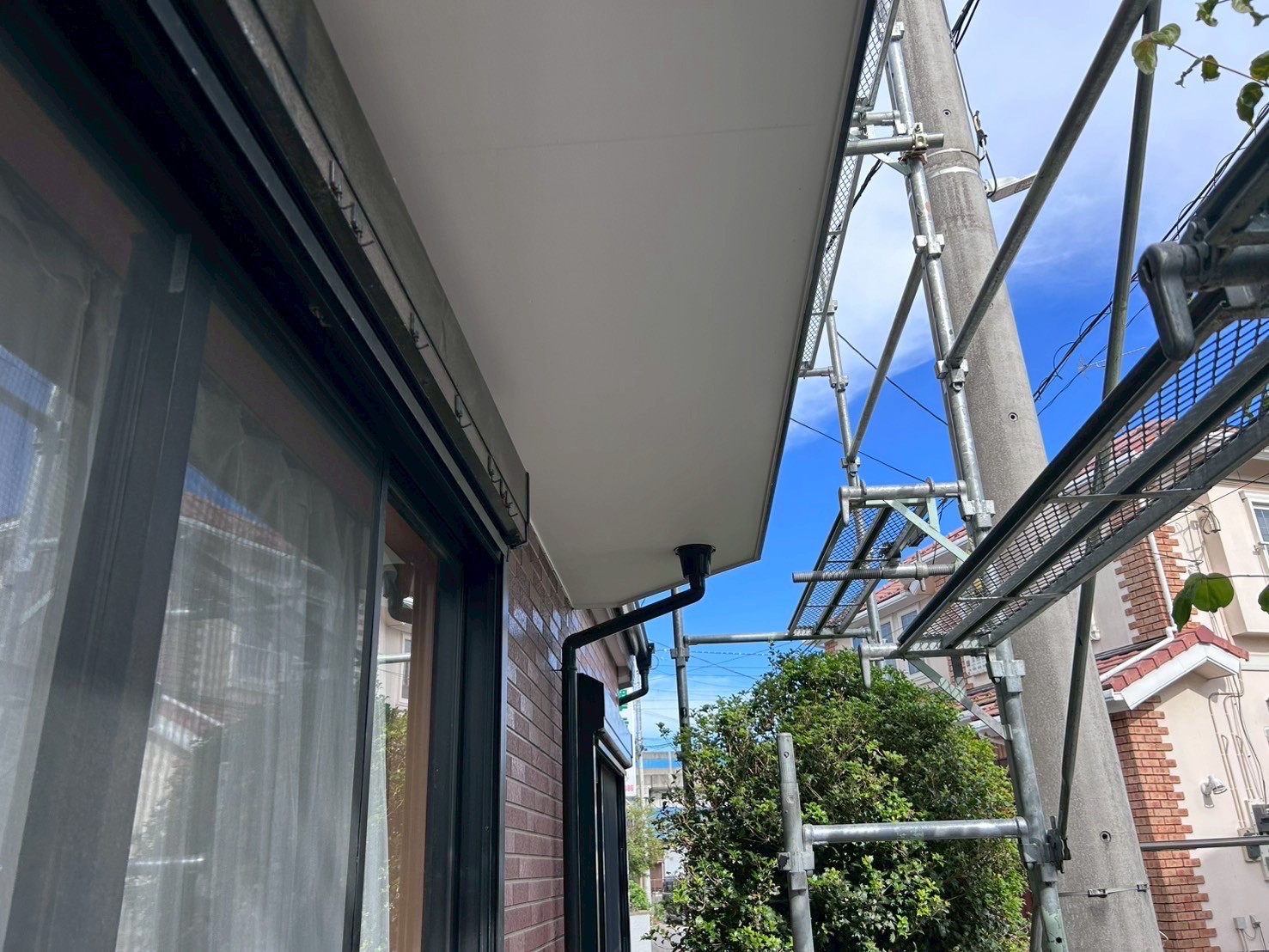 施工にあたり足場工事、笠木交換、軒天張り替え、そして軒天塗装で仕上げました。