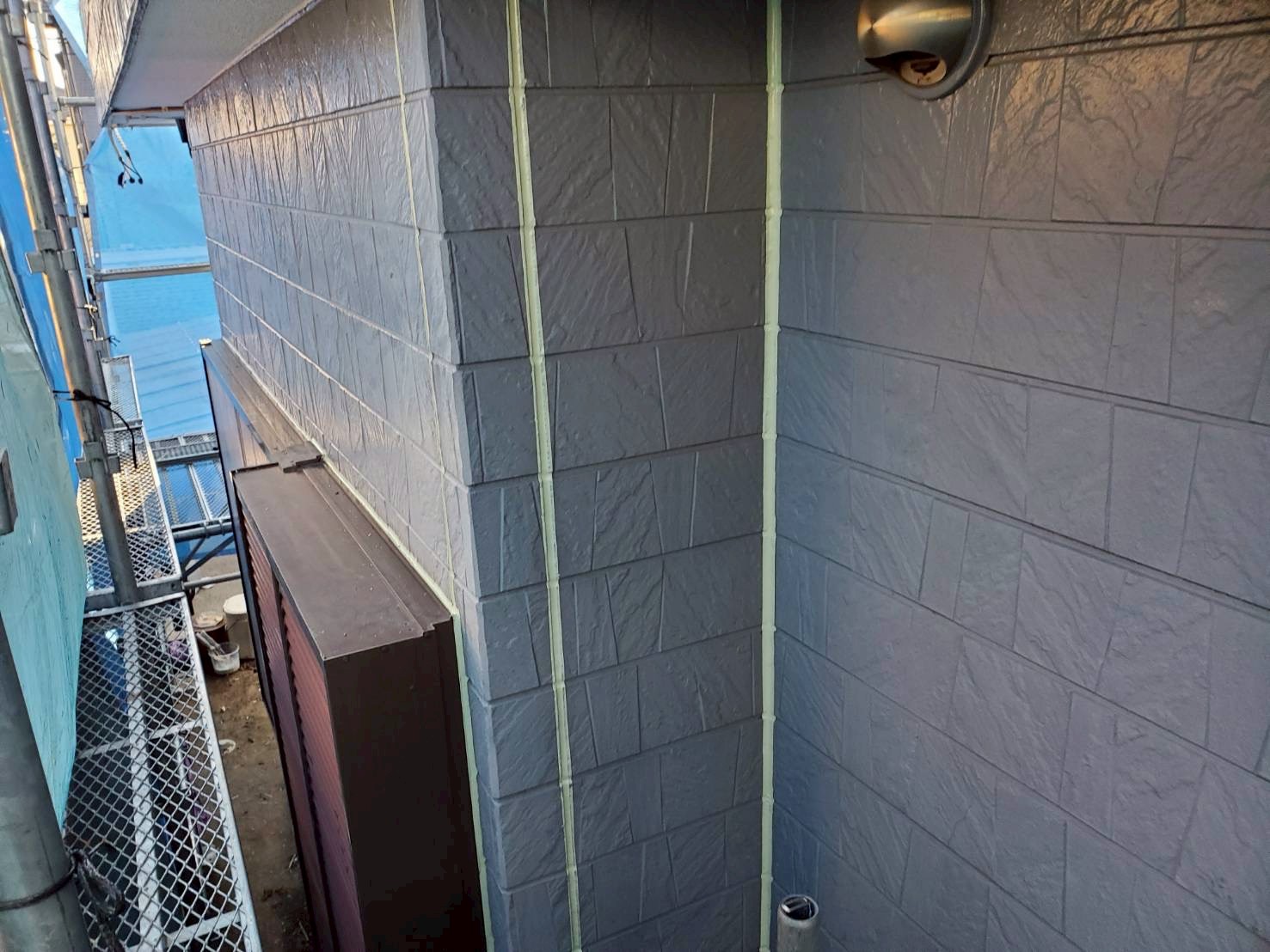 コーキングは冊子周り含めて外壁色を同色のH100にて打ち替えし、万が一の塗膜ひび割れに対する予防につとめました。